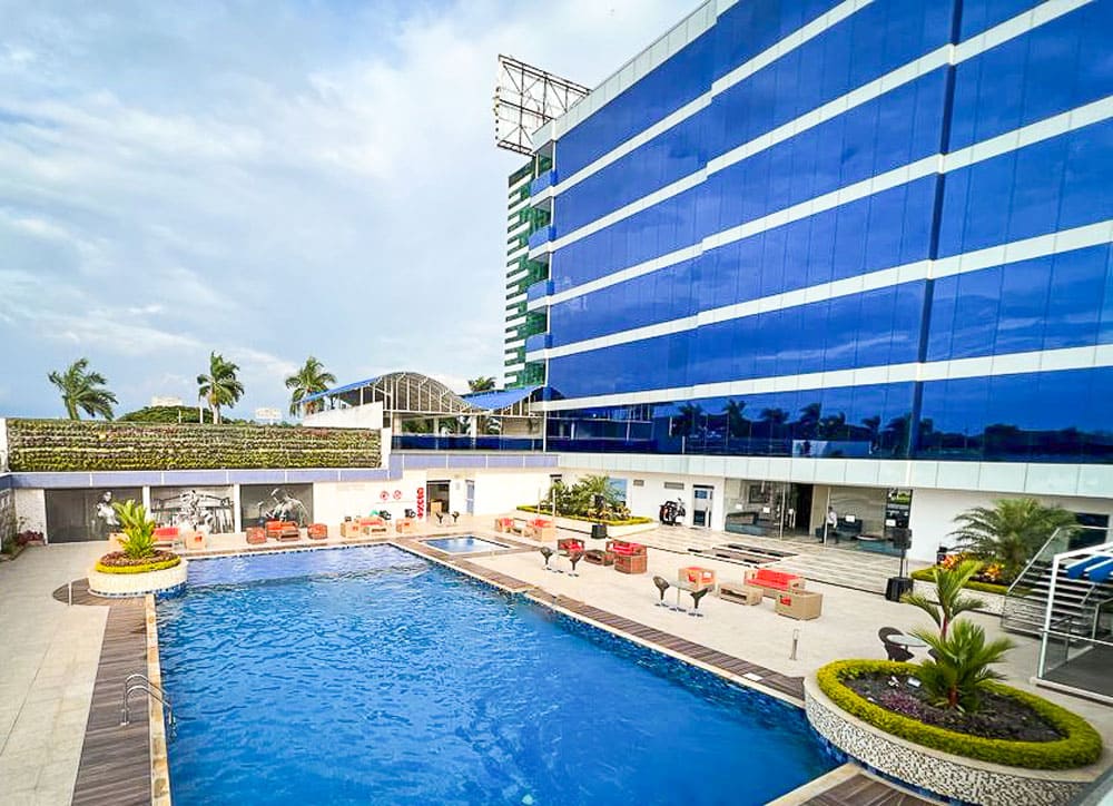 Encuentre un espacio de bienestar y diversión en la zona húmeda de Royal Elim International, escape de la rutina y disfrute de un hotel con piscina para niños y adultos a pocos minutos de la ciudad de Cali, viva un momento de relajación en el jacuzzi o sauna y tome el sol en la amplia zona alrededor con asoleadoras y salas de descanso mientras disfruta de una deliciosa limonada o soda de nuestro restaurante.